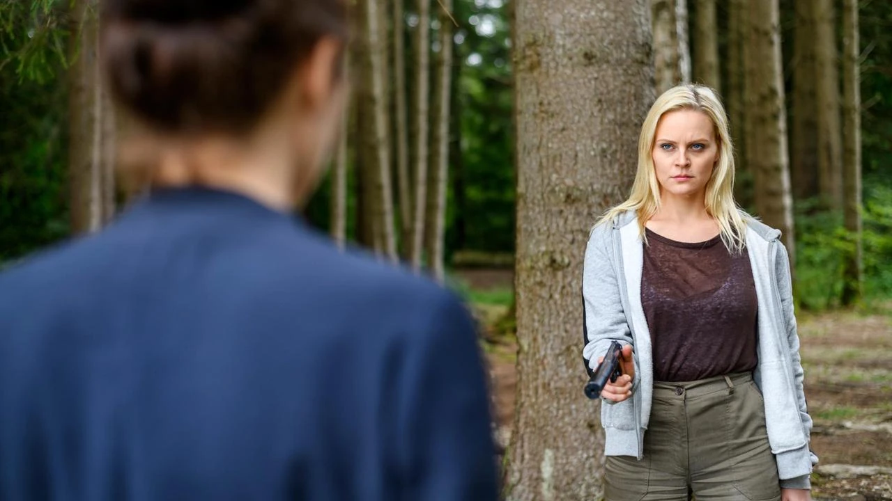 Hasserfüllt zielt Annabelle mit einer Pistole auf Denise.