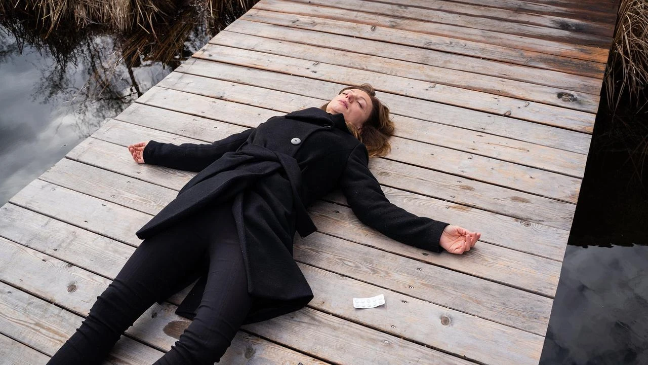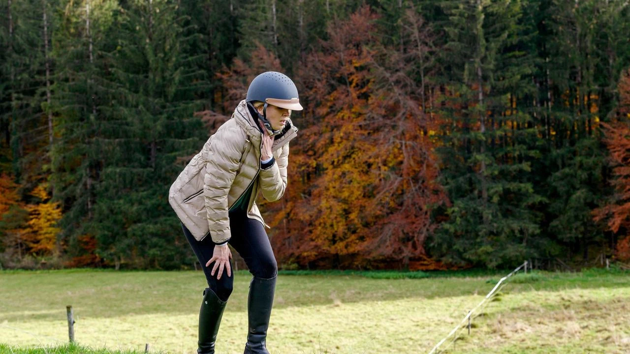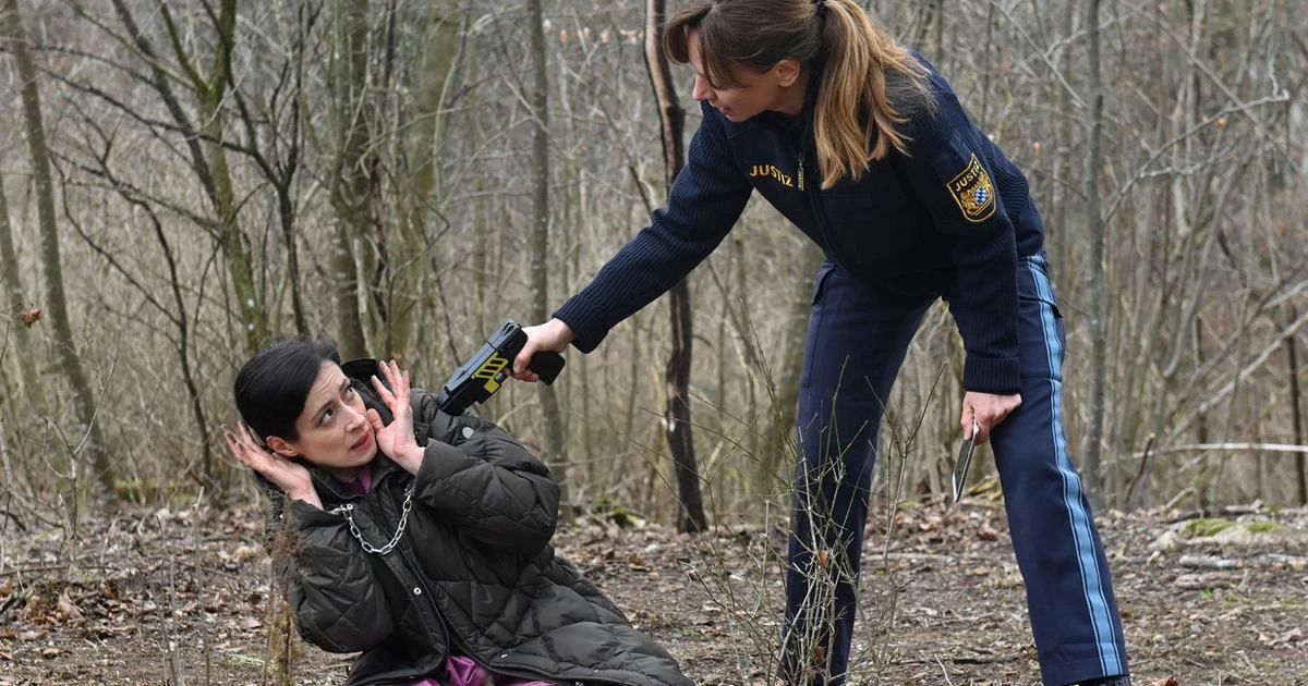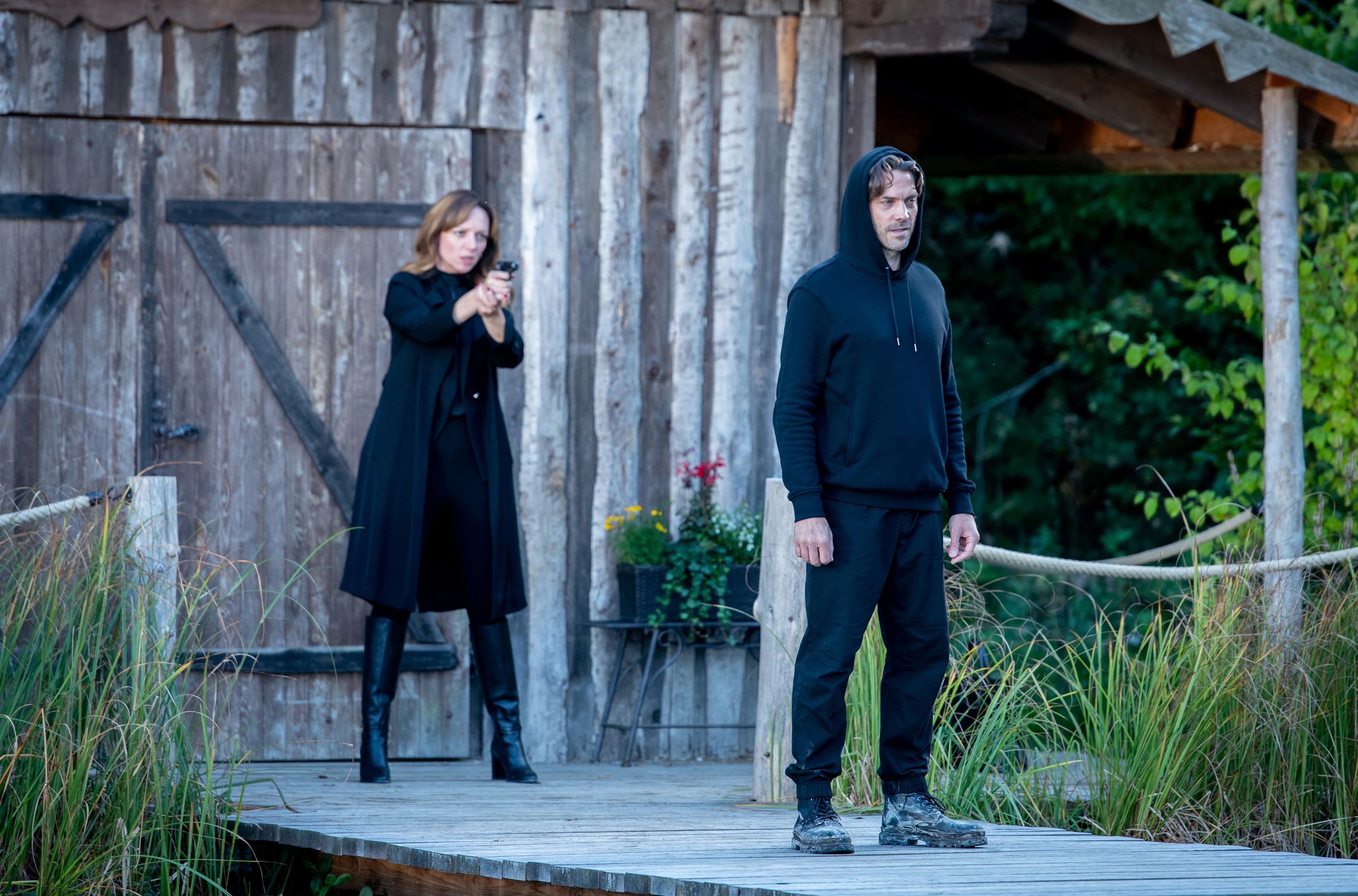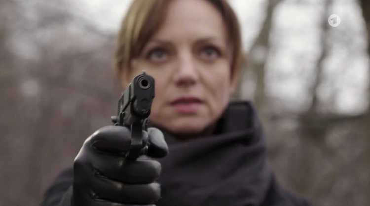 Als Ariane am See Karls Stimme hört, zückt sie ihre Pistole.
