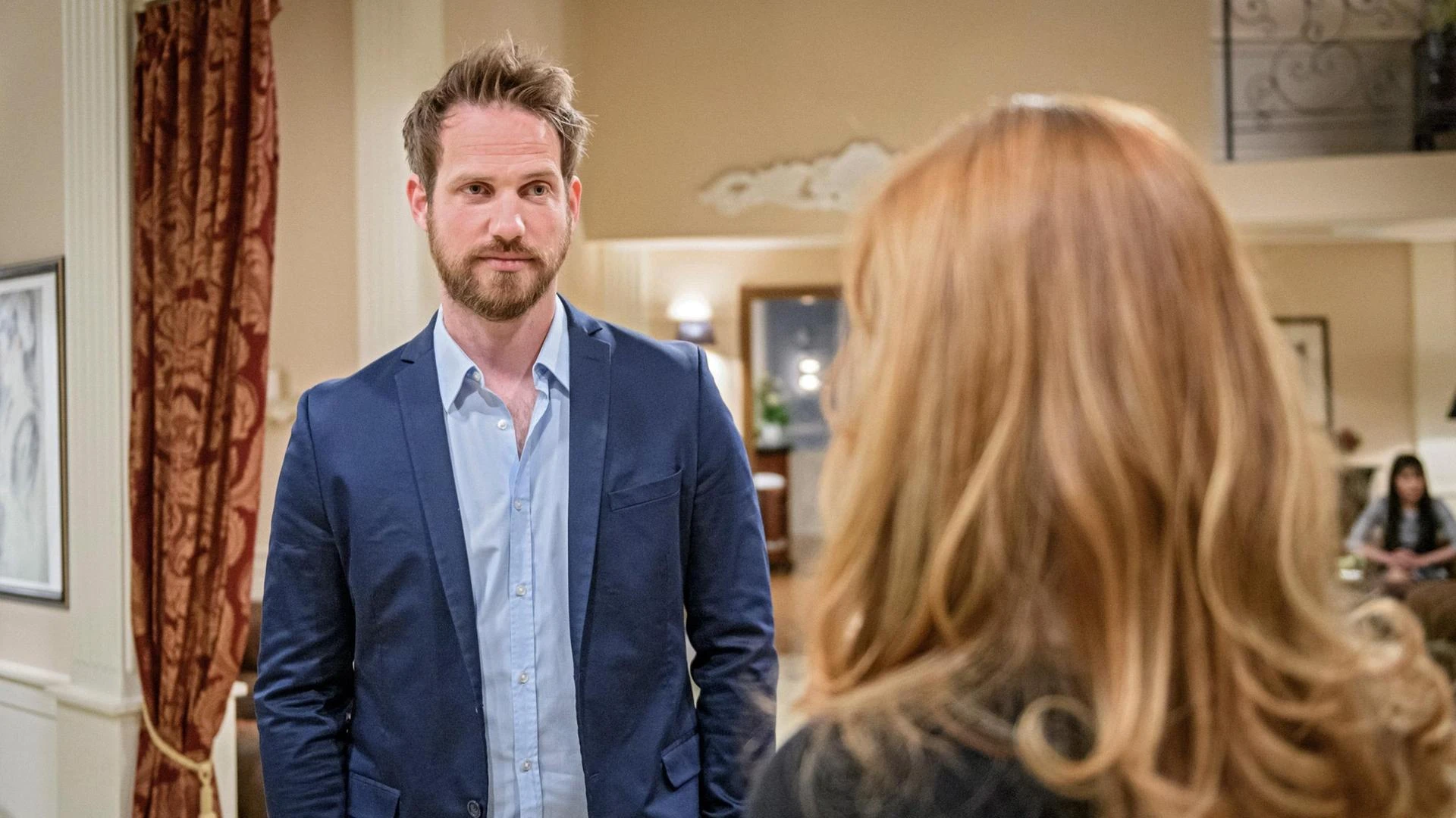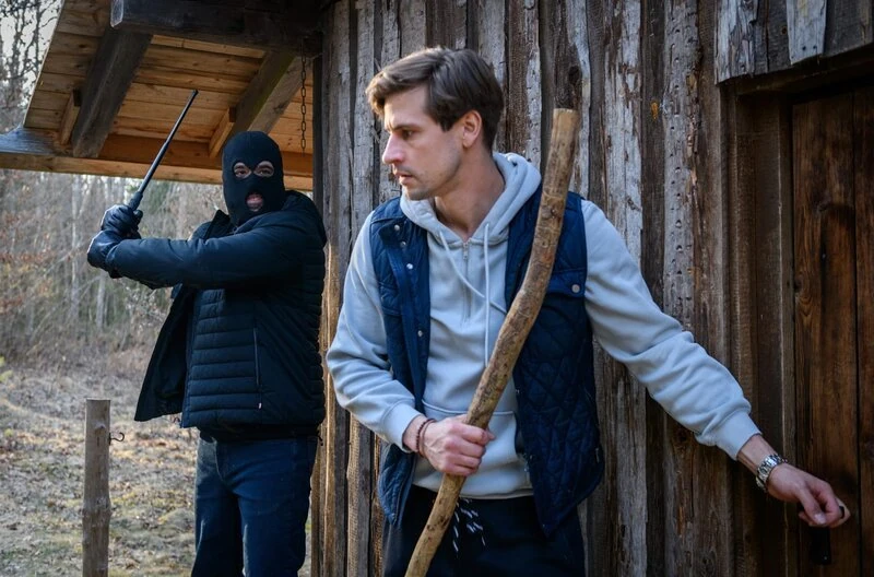 Ariane erschrickt vor Robert im Dunkeln und attackiert ihn beinahe mit einem Leuchter.