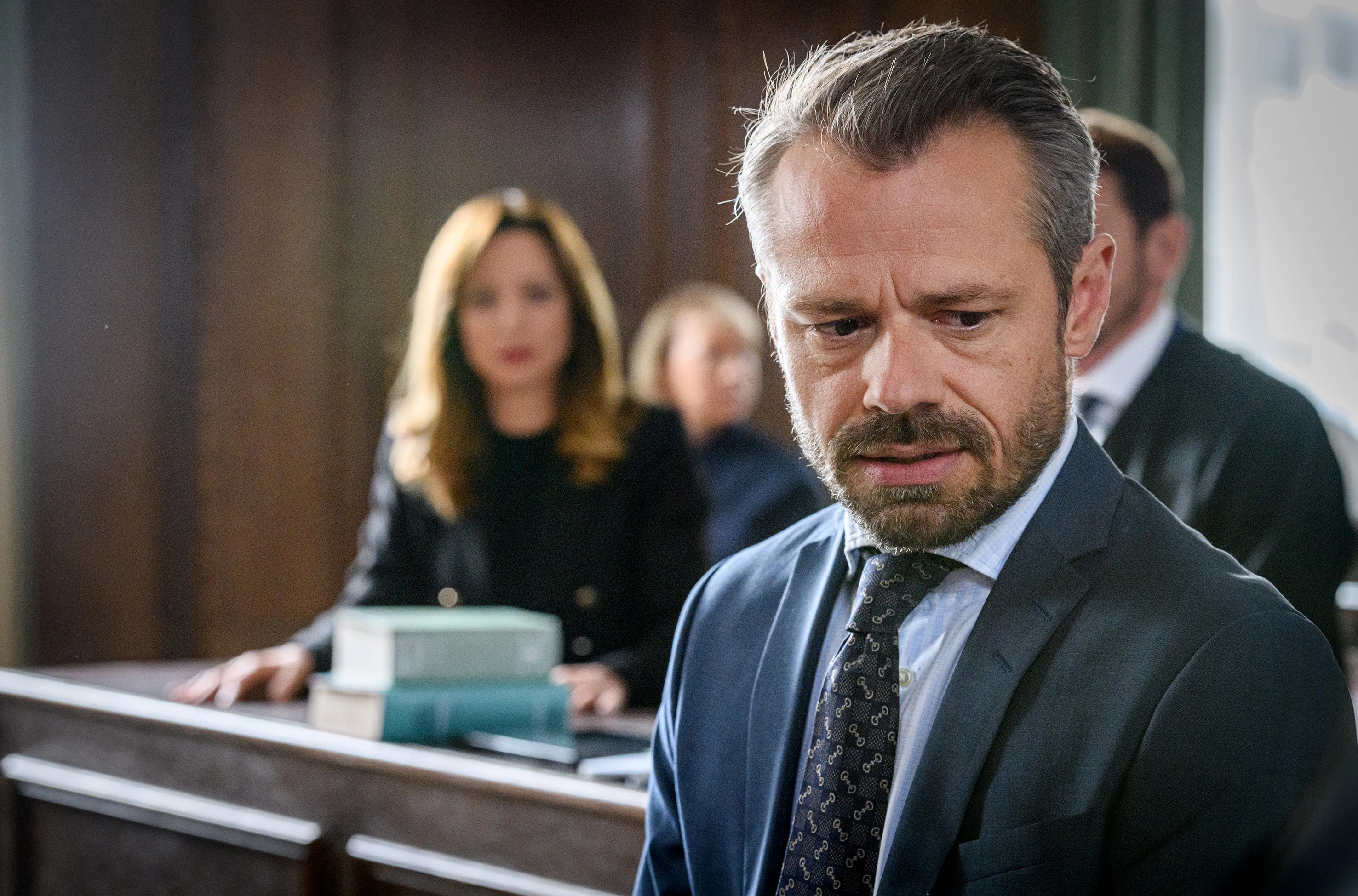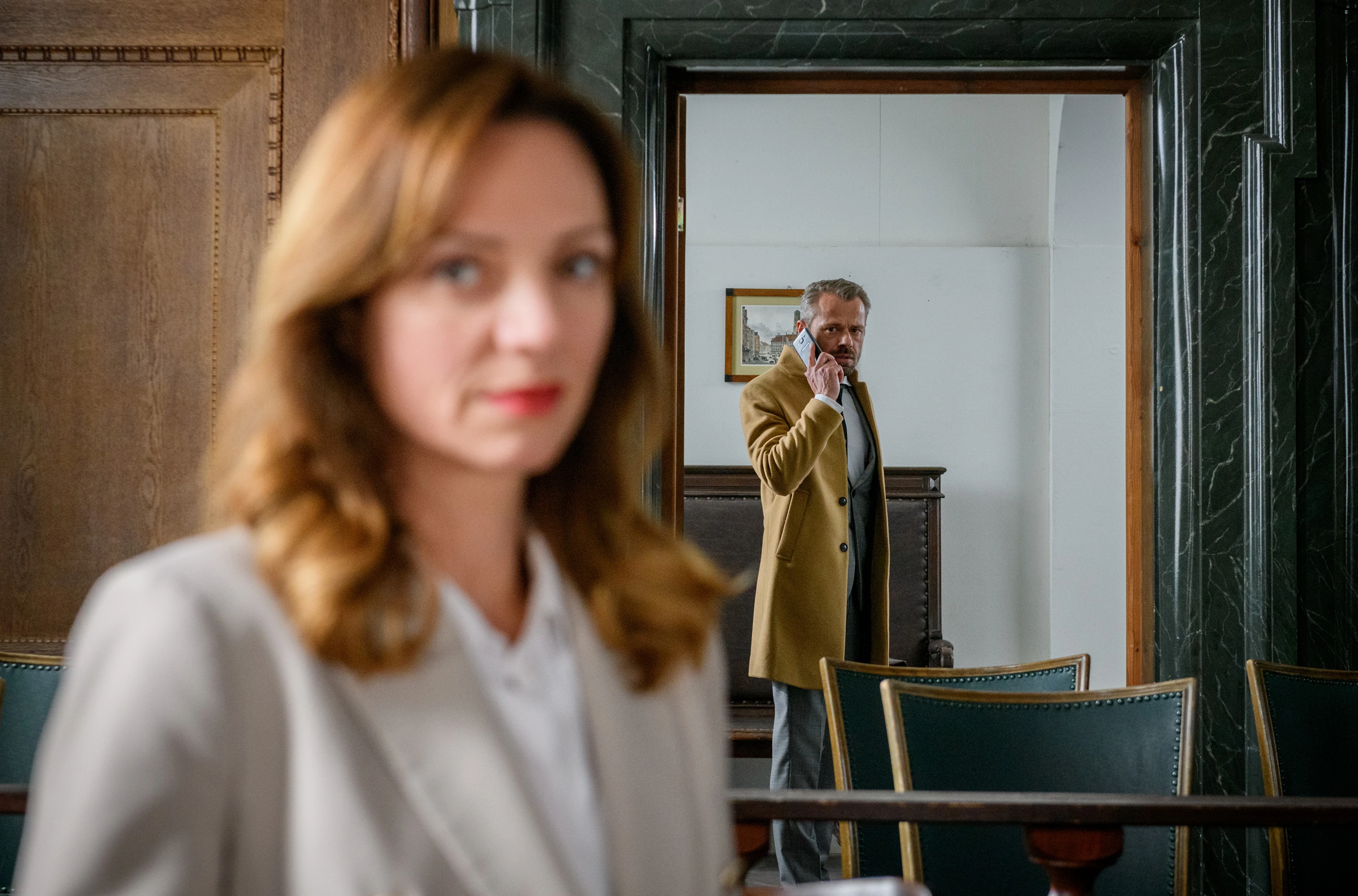 Ariane erklärt ihrem Anwalt, dass Erik beim Prozess zur Gefahr für ihre Strategie werden könnte.