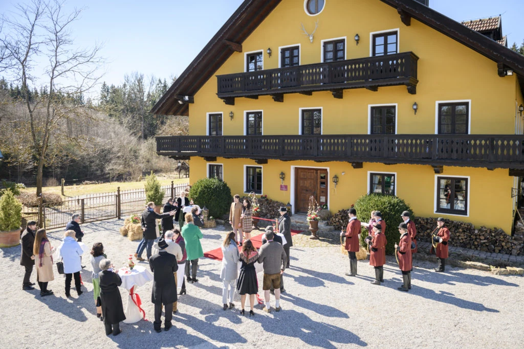 Das Gestüt des Fürstenhofs liegt direkt neben dem Fürstenhof selbst (mit Blick vom Park in Richtung Haupteingang links) und ist über einen kurzen Fußweg vom Hotel aus zu erreichen.