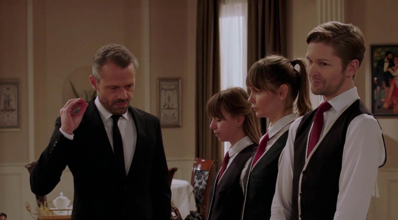 Felix Tarrasch mit dem Personal des Restaurants in Staffel 1